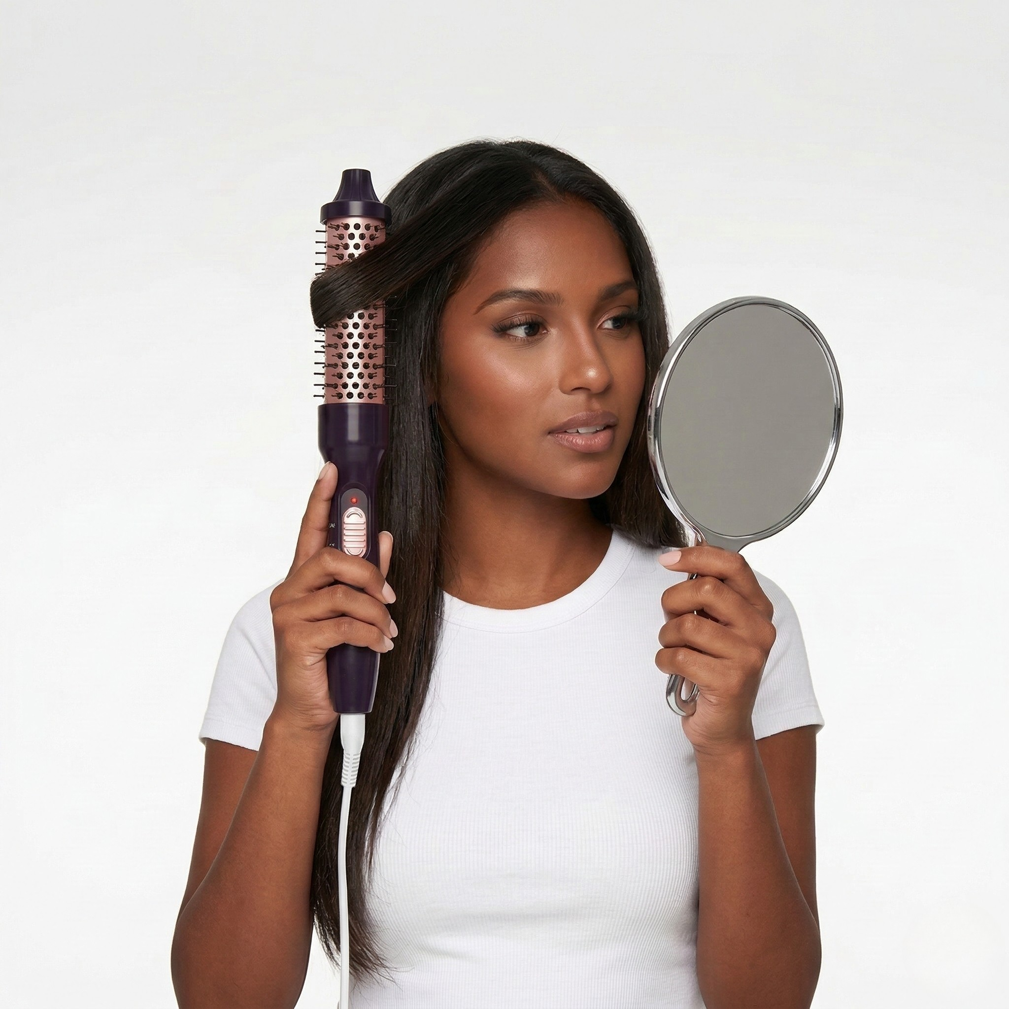 Para un look liso y pulido, pasa el cepillo directamente hacia abajo. Si prefieres ondas o rizos con movimiento, enrolla las puntas y suelta con suavidad para un acabado impecable digno de salón. ✨